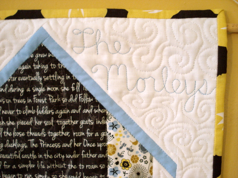 One of my goals for 2013 is to practice some more free-motion quilting patterns.  Santa Clause brought me some great books about it!  In this tiny quilt I tried some swirls, a flower, and writing the family's name in cursive.